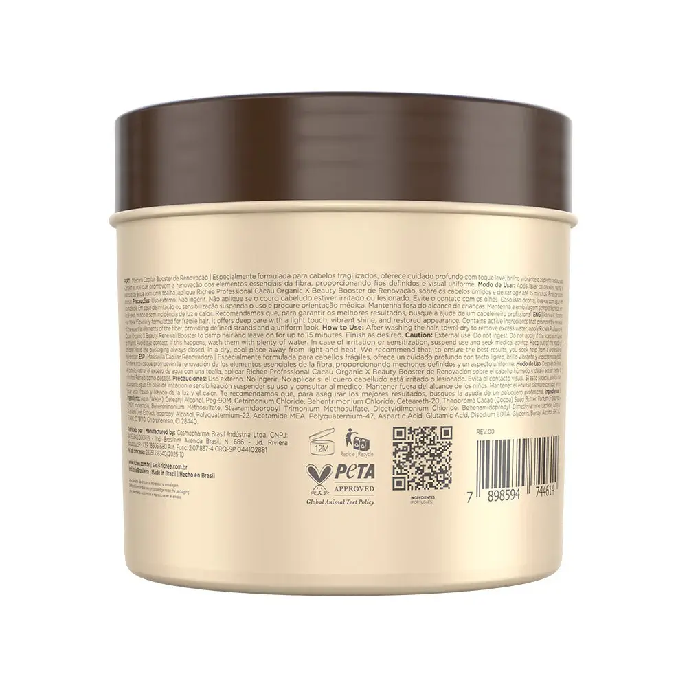 Richée Cacau Organic X Beauty Botox – tai intensyvi atstatomoji procedūra visų tipų plaukams, sukurta profesionaliam naudojimui salonuose. Formulė veikia plauko vidų ir išorę, skatindama skaidulų atsinaujinimą, atkurdama prarastą masę ir suteikdama sruogoms tolygų, sveiką vaizdą.